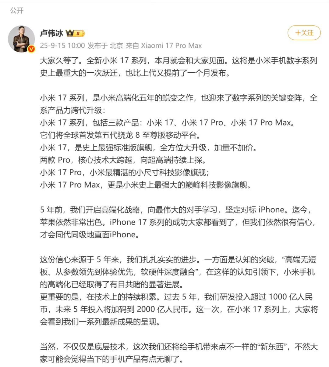 小米这波操作给我看傻了!好好的小米16直接“飞升”成小米17,卢伟冰一句 “同代同级对标iPhone”,把营销套路玩得明明白白。法律上确实挑不出错,但从品牌逻辑看,这简直是自毁认知资产。