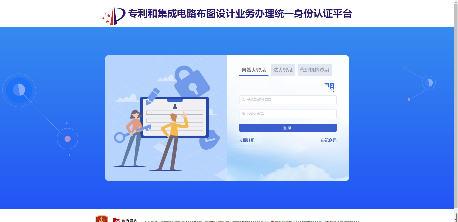 支持三类用户登录:自然人(用手机号/证件号)、法人、代理机构,注册后使用更便捷。