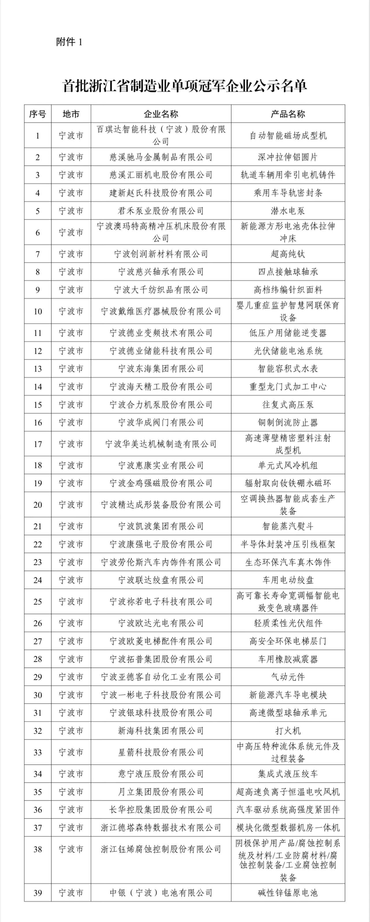 为贯彻落实关于加快培育发展制造业优质企业的指导意见,以及《关于开展首批浙江省制造业单项冠军企业遴选认定工作的通知》(浙经信大企便函〔2025〕88号),按照浙江省经济和信息化厅有关审查工作要求,现将我市首批浙江省制造业单项冠军企业拟认定名单予以公示。